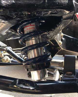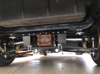 Hyperco adjustable coil over shocks, Van Steel tubular control arms, one piece fiberglass rear spring, Bilstein shocks, steering system converted to Steeroids rack and pinion, all chrome power brake booster and master cylinder, chrome power steering pump and brackets, cross drilled brake rotors, brand new front and back brake calipers.